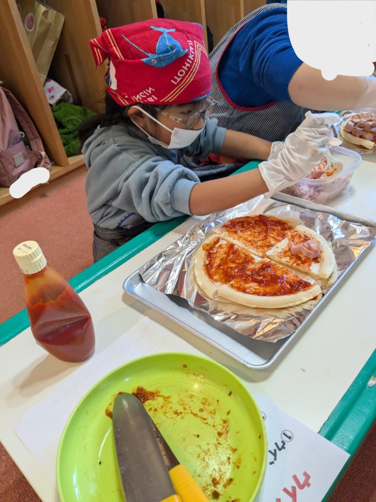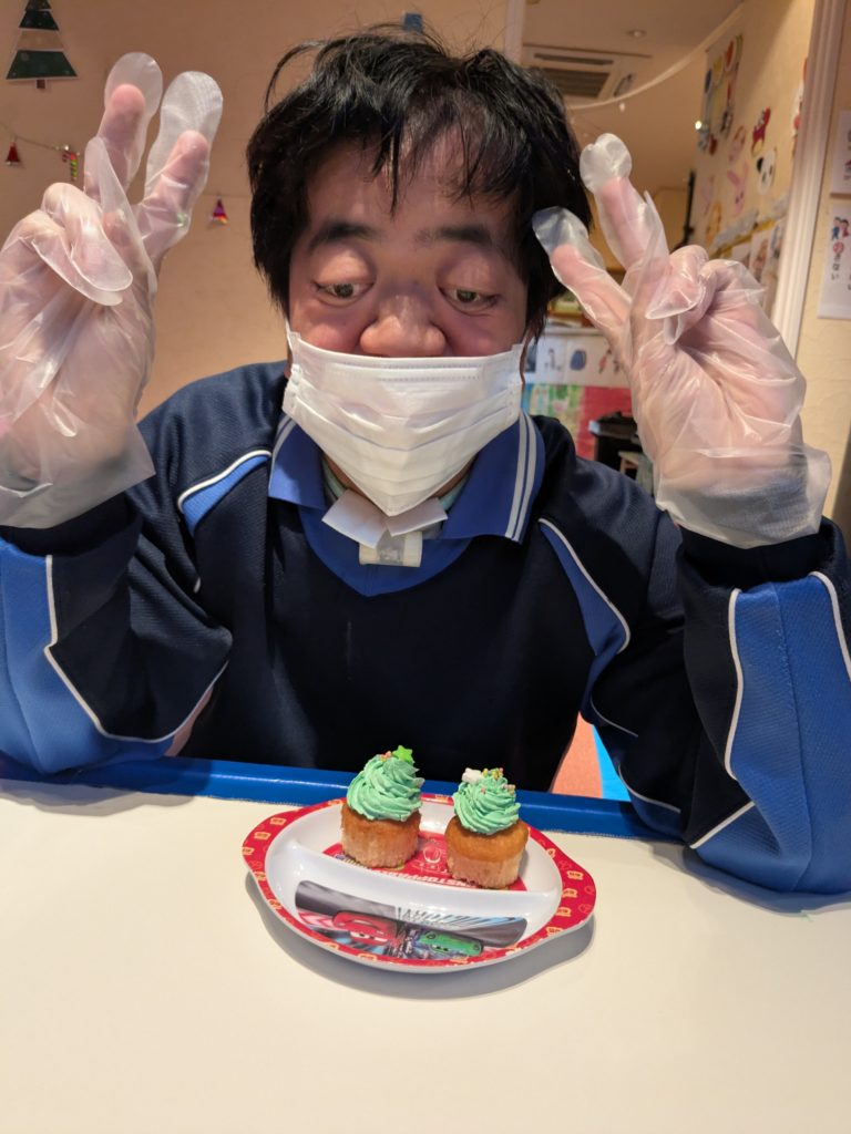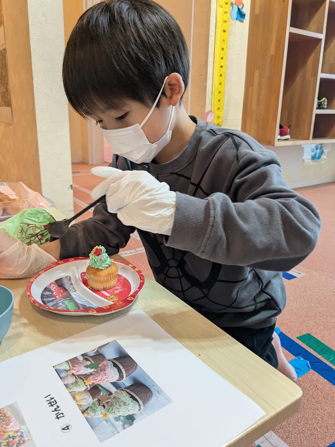 午後はお待ちかねのケーキ作り🍰カップケーキのうえにクリームしぼって、お星さま飾りつけたら、かわいいツリーの完成🎄⭐あまくておいしかったみたいですよ😄