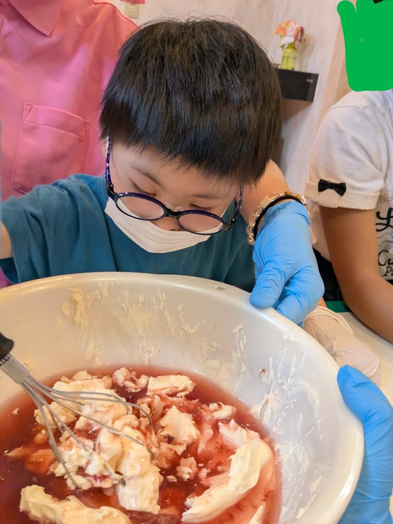 25日の活動の様子です🌤️なめらかになるまでみんなで協力してまぜました🫡あとは冷蔵庫へ・・・🎂