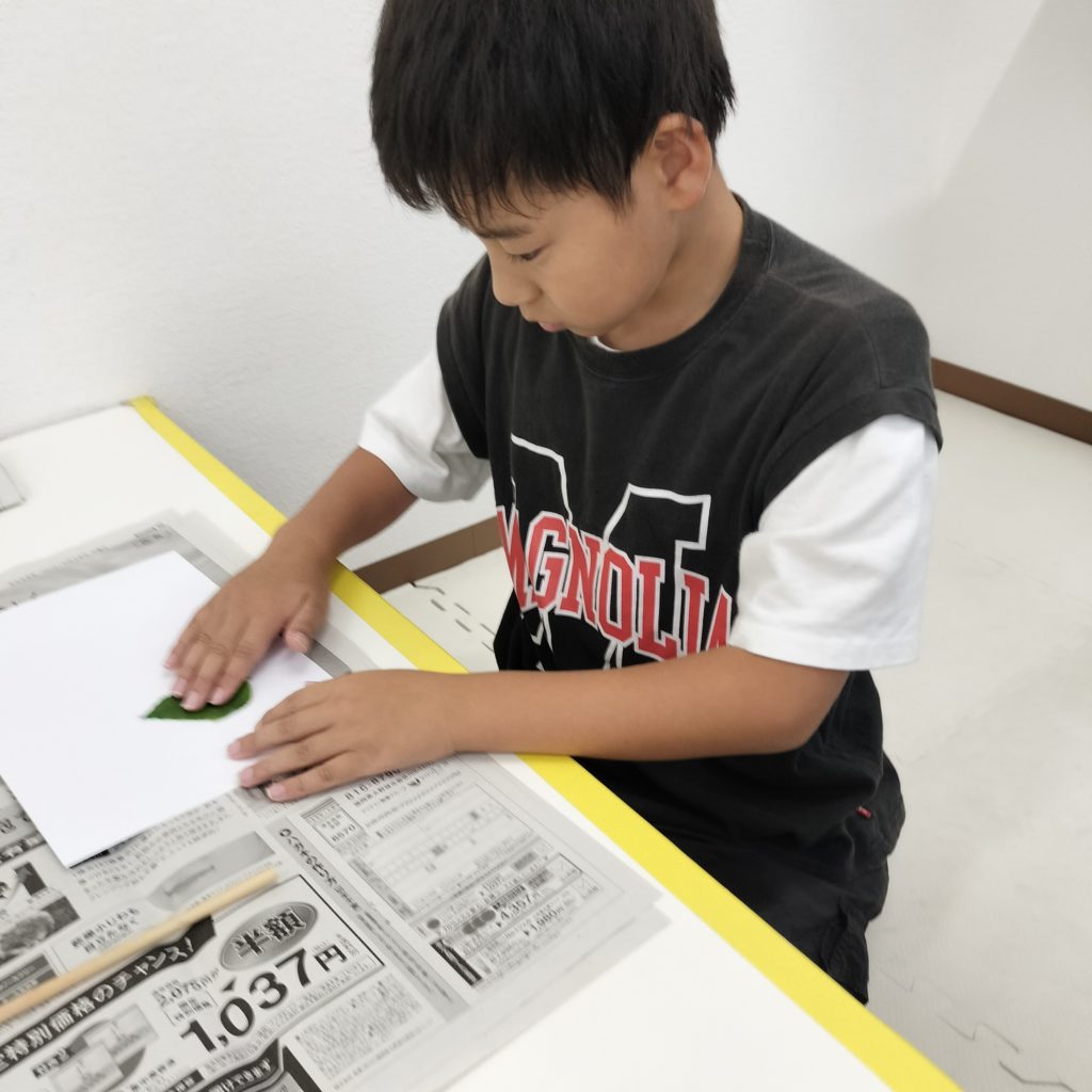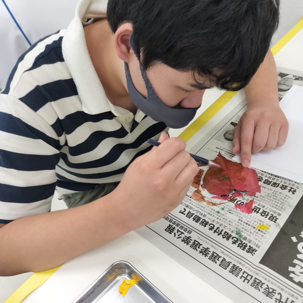 落ち葉に絵の具を塗ってスタンプをしました🍃