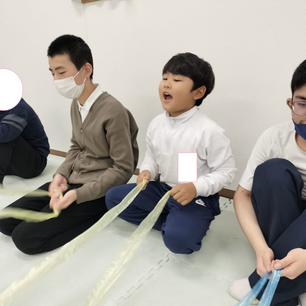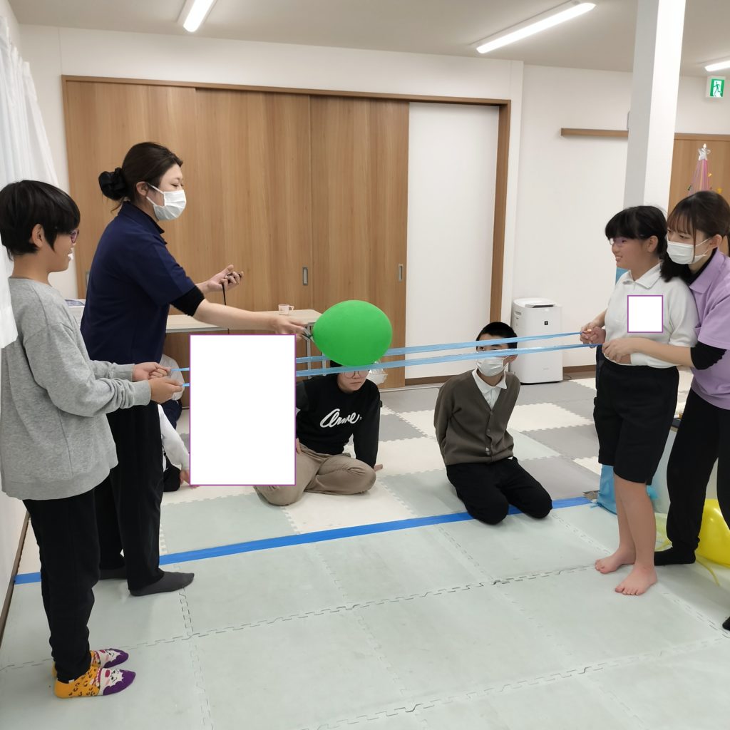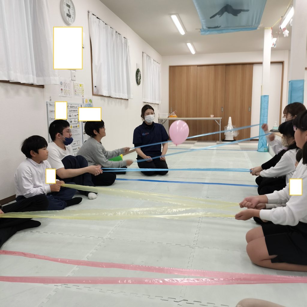 グループの子とひもを使って風船をゴールまで運べるかな⁇🎈